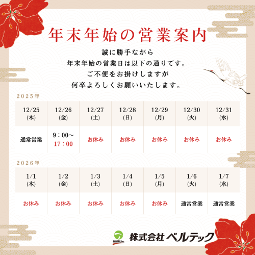 2025年12月26日 (金) は、17時までの営業とさせていただきます。